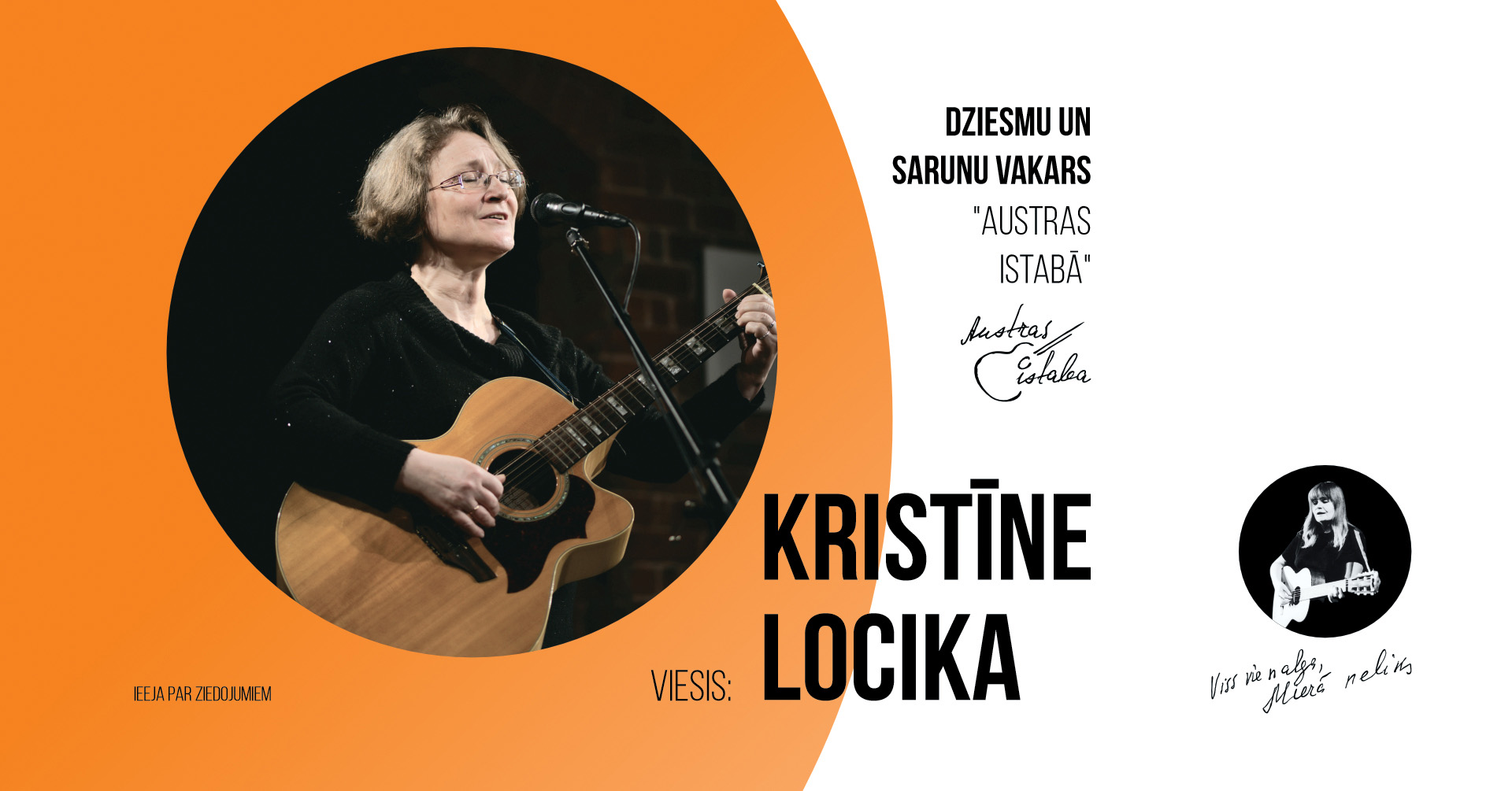 “Austras biedrība” aicina uz akustisku dziesmu un sarunu vakaru radošajā telpā “Austras istaba”, kur šovakar, 24. martā, pulksten 19.00 viesosies dziesminiece un Austrasbērns Kristīne Locika. Tā būs silta saruna par leģendāro dziesminieci Austru Pumpuri, viņas personību un nospiedumiem, ko viņa atstājusi līdzcilvēkos. Kopā ar Kristīni ieskatīsimies un ar viņas komentāriem iepazīsim arī Austrai Pumpurei veltīto jauno ekspozīciju “Viss vienalga, mierā neliks…” un ieklausīsimies Kristīnes Locikas dziedātajās dziesmās ģitāras pavadījumā. Ieeja par ziedojumiem.