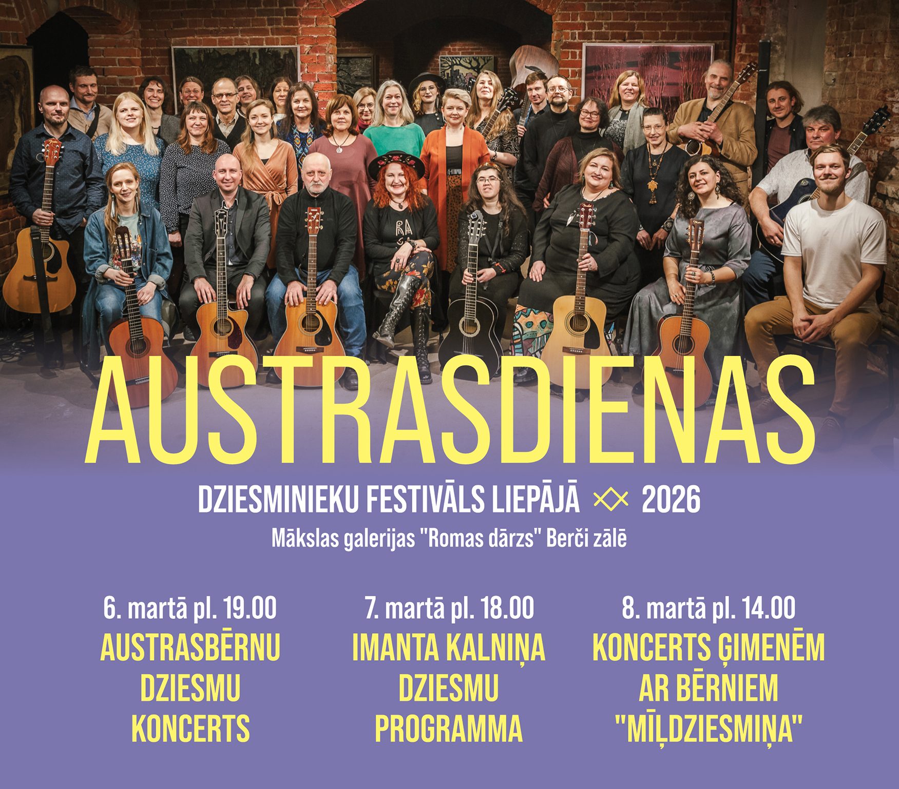 Šogad koncertos Liepājā klausītājus priecēs tādi dziesminieki kā Vita Krūmiņa, Kristīne Locika, Laine Ligere-Stengrevica, Ziedonis Stutiņš, Agita Stutiņa, Arnis Miltiņš, Uldis Ozols, Zanda Štrausa, Jana Egle, mūziķu apvienība “Labums” (Simona Rača-Rūce, Jānis Rūcis, Roberts Dinters), Inese Muižniece, Laura Drēziņa, Dainis Baldzēns, Kristaps Sudmalis, Ēriks Zeps, Laura Vītola, Dzintars Vītols, Vita Dambe, Ilona Bogomola, Ilze Kovere, Andris Davidons un daudzi citi Austrasbērni.